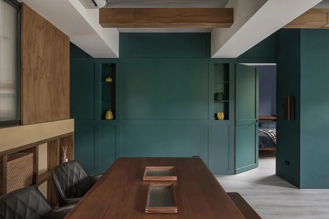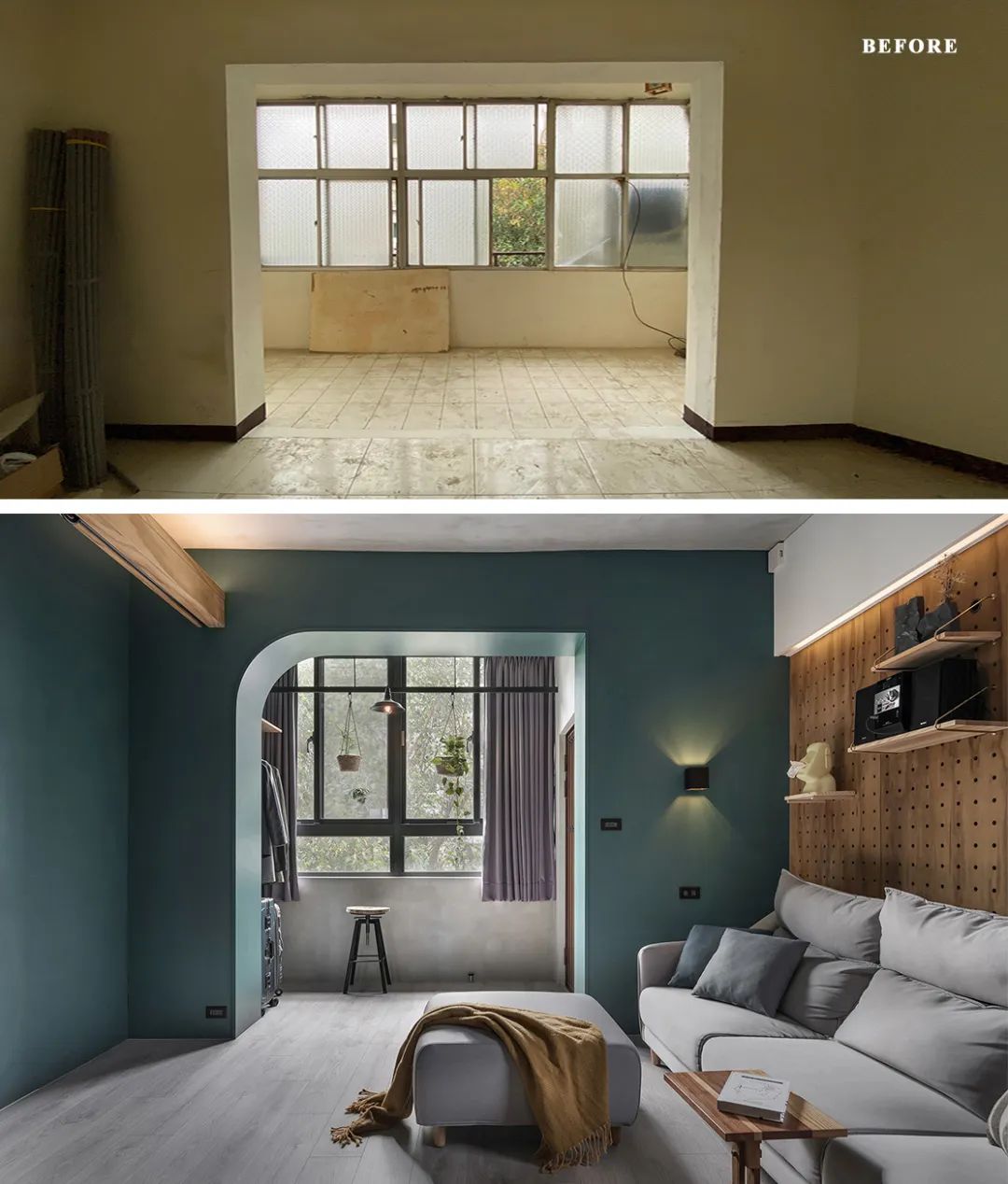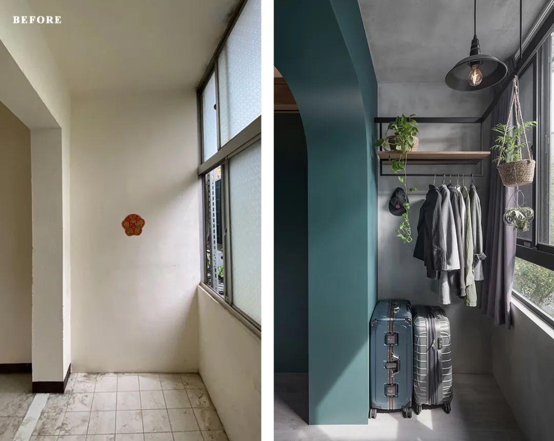 改造后的玄關(guān),用圓弧型埡口消融生硬感,墨綠色+水泥原色的搭配,仿佛回歸自然,與窗邊隨風搖曳的婆娑枝葉,相映成趣。