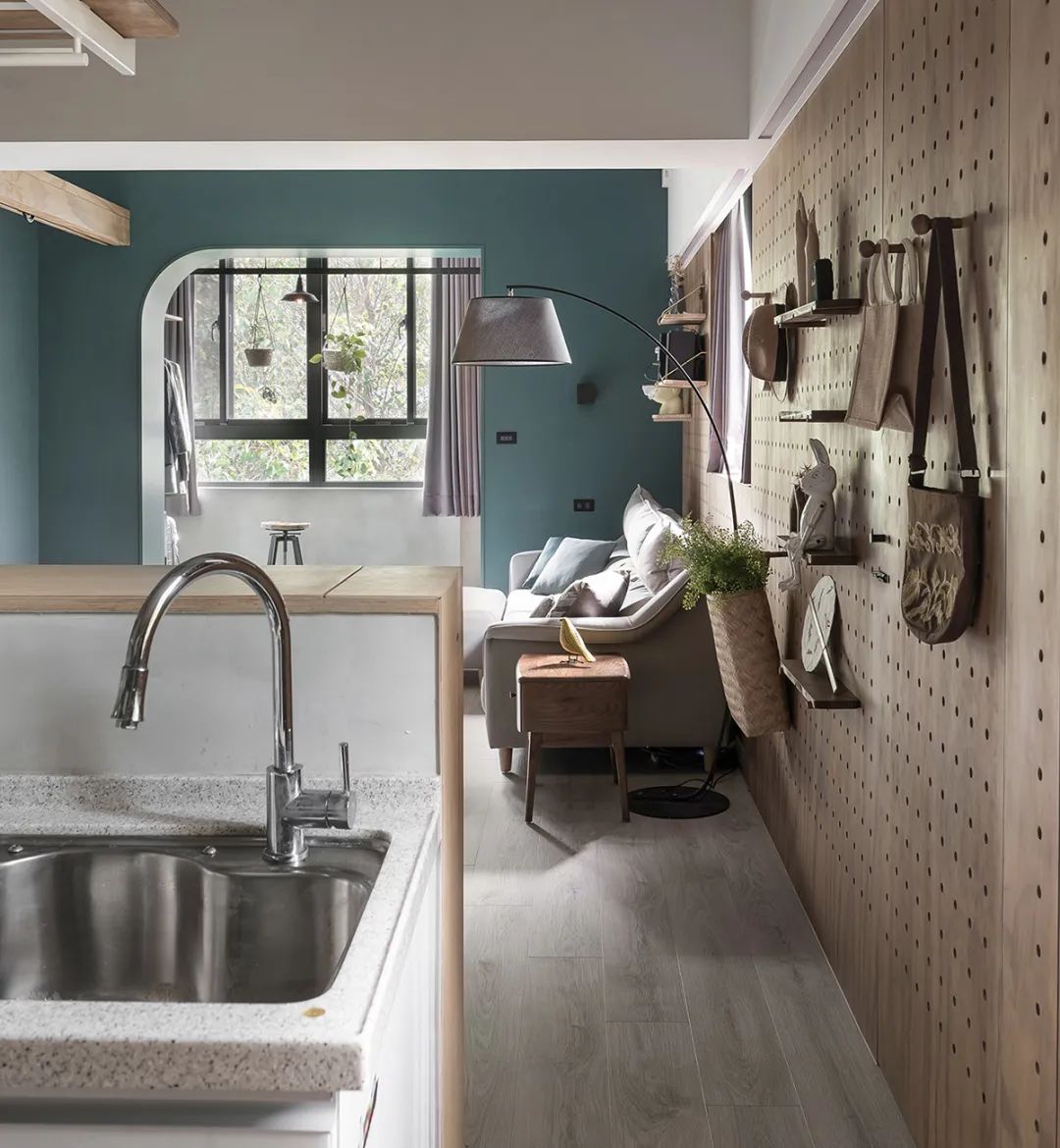 打破廚房藏于角落的宿命,改造時把它往前挪移,結(jié)合長虹玻璃拉門與活動洞洞板門板的方式,巧妙地將廚房改成半開放式,既可以阻隔油煙又保證空間的流暢感。