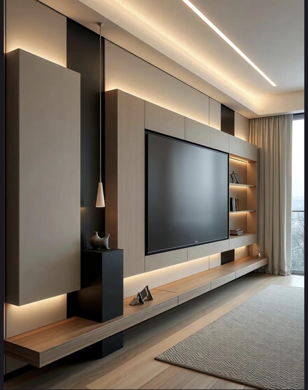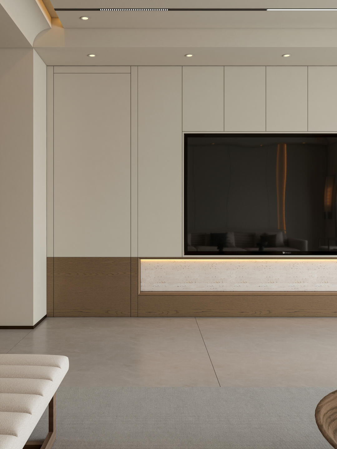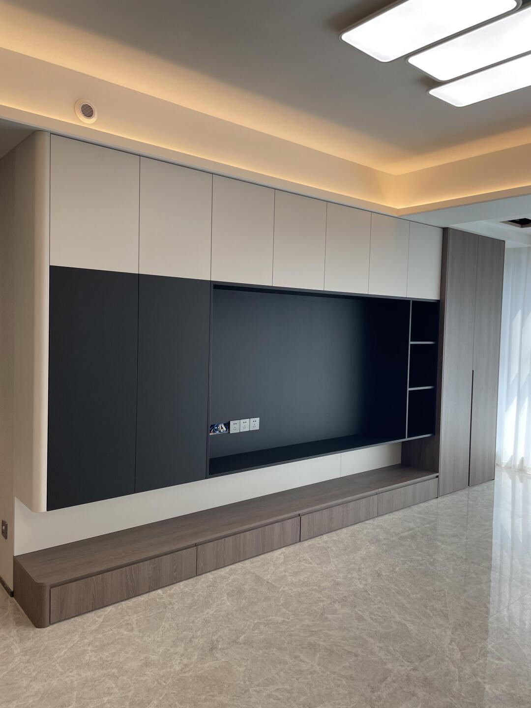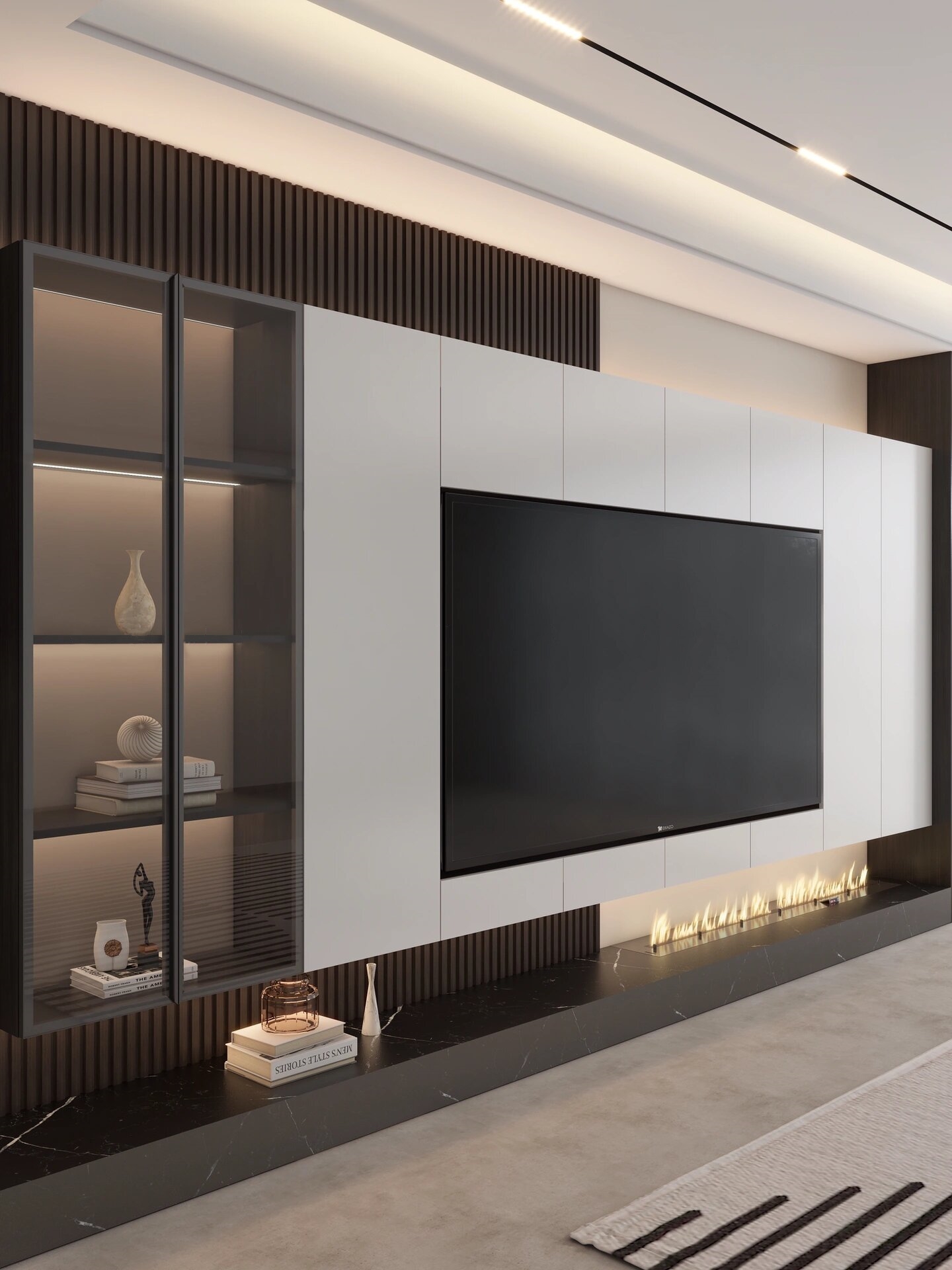 第一款,簡約高級感直接拉滿!整體以柔和淺色調(diào)為主,搭配木質(zhì)元素,溫暖又大氣。柜體設(shè)計簡潔利落,無多余裝飾卻質(zhì)感十足,下方燈帶柔和,氛圍感拉滿,看電視超有沉浸感,顏值與實(shí)用并存。