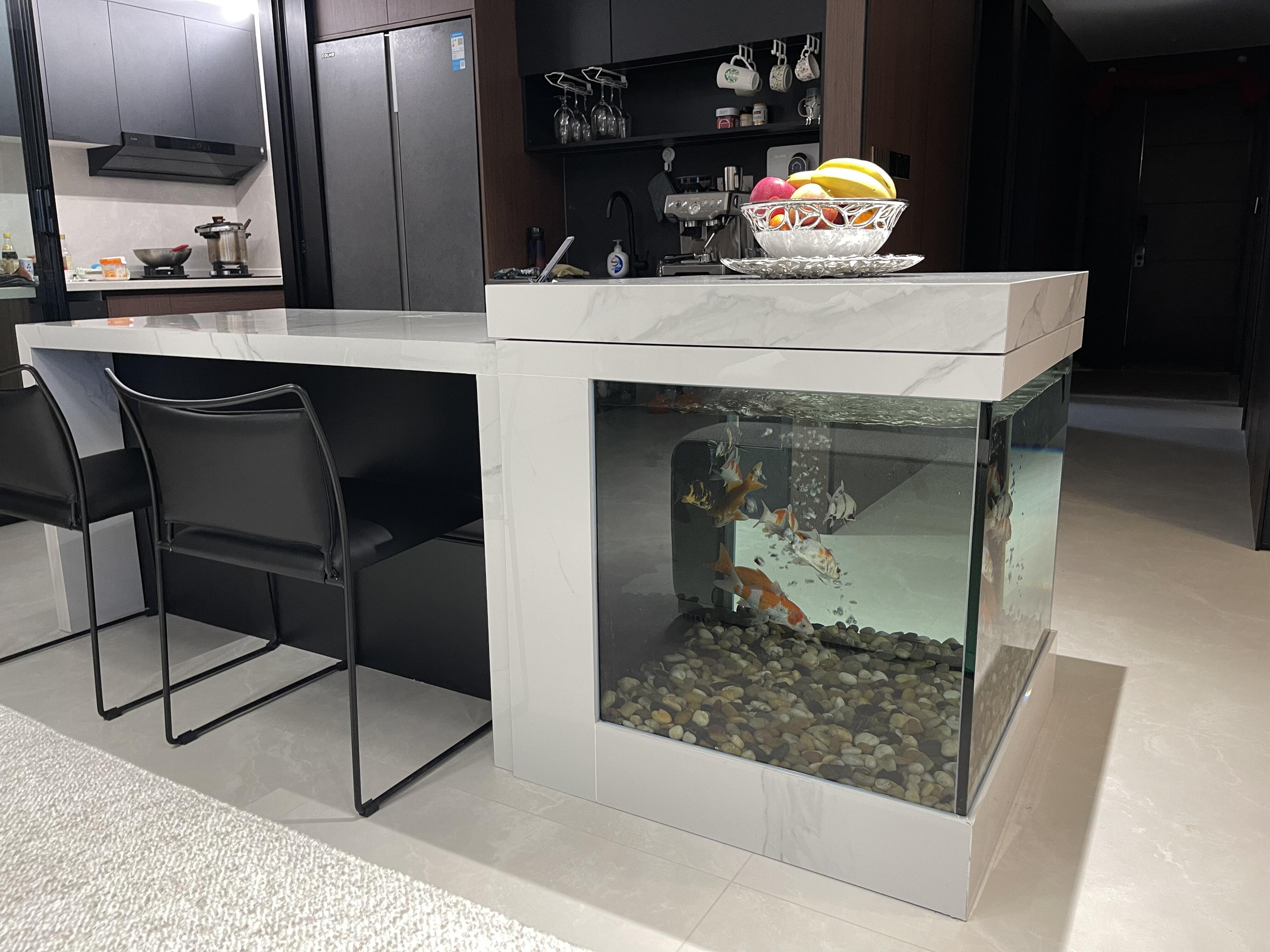 在設(shè)計上,它高效利用墻體或柜體空間,解決傳統(tǒng)魚缸占獨立空間的問題。且嵌入式結(jié)構(gòu)使其成為視覺焦點,水中游魚與造景呼應(yīng),為空間注入自然生機,無論是客廳作為藝術(shù)點綴,還是廚房增添生活意趣,都能打破水族與空間的邊界,讓水族藝術(shù)深度融入空間肌理,為居住者打造獨特且富有生機的居住體驗。