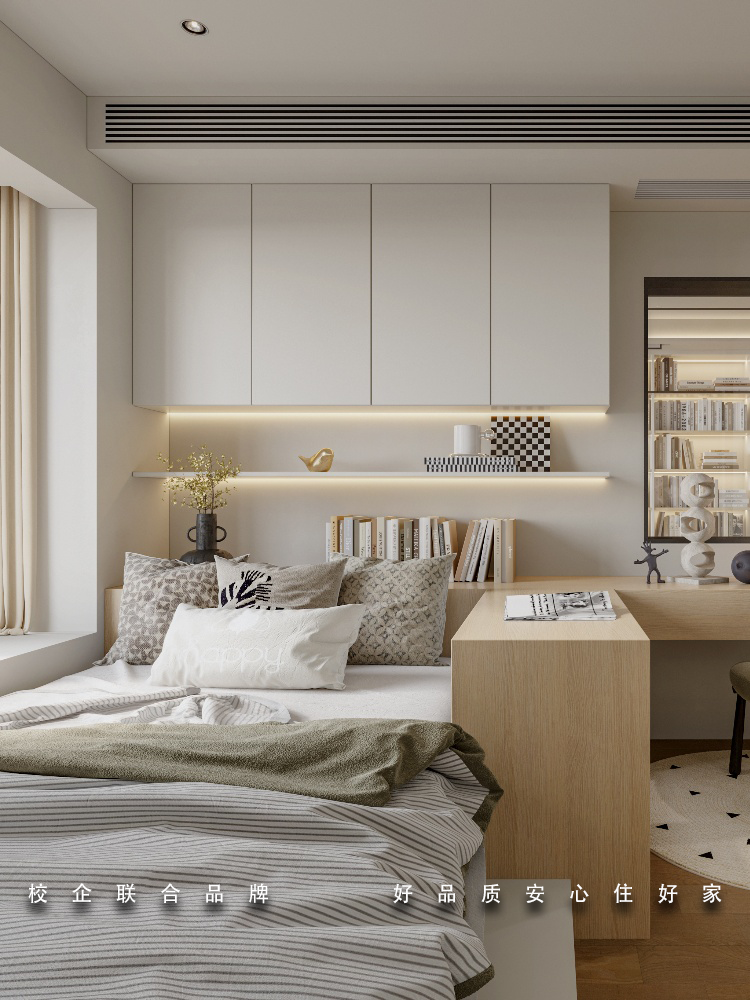 臥室與工作區(qū)的融合設(shè)計(jì),在有限空間內(nèi)滿足了休憩與辦公的雙重需求,玻璃元素的運(yùn)用也增強(qiáng)了空間的通透度,整體實(shí)現(xiàn)了在小戶型中對(duì)舒適與實(shí)用的較好營(yíng)造。