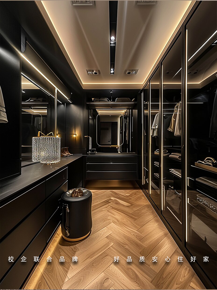 有極具高級感的黑金色系衣帽間,走的是輕奢風(fēng),冷冽的黑色搭配精致的金屬線條,氣場拉滿;衣帽間的鏡面、精致擺件,提升了空間的奢華感,而充足的收納分區(qū),讓衣物、配飾都能各得其所;