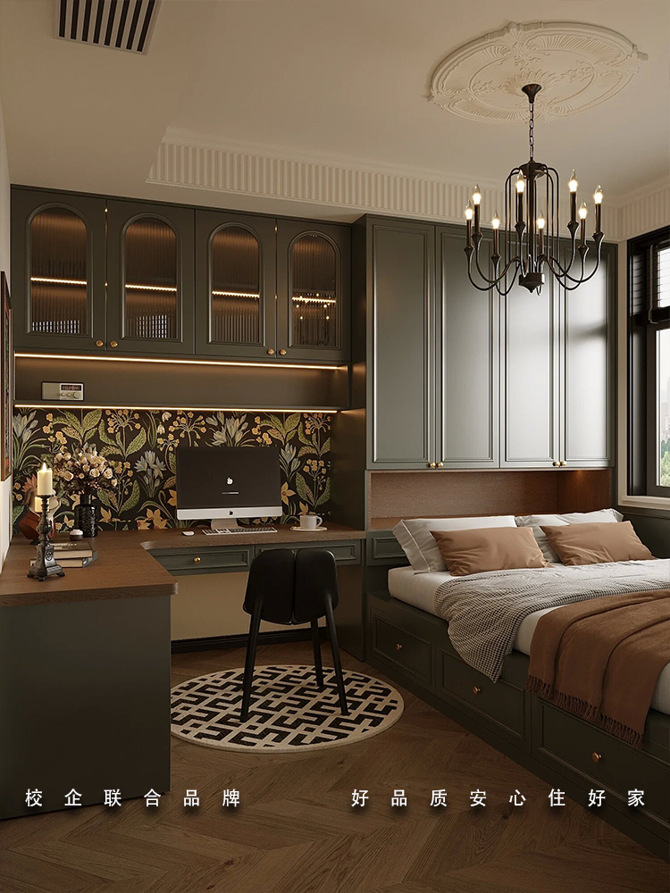 還有臥室的復(fù)古混搭風(fēng),莫蘭迪灰綠配上復(fù)古花紋,優(yōu)雅又有故事感;這里的一體化設(shè)計,把書桌、衣柜和床完美結(jié)合,還有超多的收納空間,連床底都利用起來了;