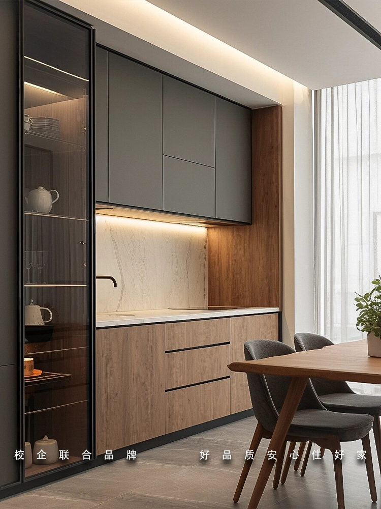 餐廳的現(xiàn)代極簡風(fēng),木色與灰色的搭配,簡潔又溫暖;