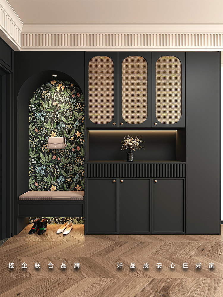玄關(guān)的復(fù)古輕奢風(fēng),黑色與藤編元素結(jié)合,一進(jìn)門就充滿格調(diào),藤編柜門、花紋壁紙很有特色,還有換鞋凳、鞋柜,實用性拉滿。每一處軟裝都不是擺設(shè),都在為生活的便利和品質(zhì)服務(wù)。