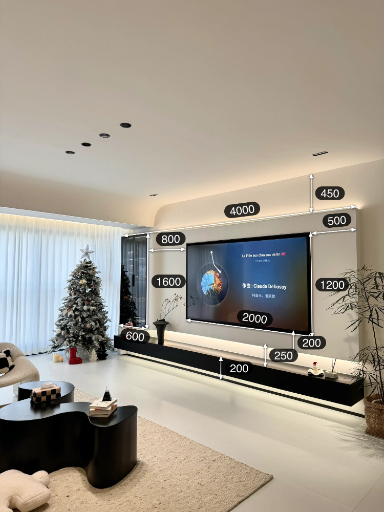 先看氛圍款無收納背景墻,簡潔的背景把大電視襯托得格外大氣,從頂部燈光到底部地臺的尺寸設(shè)計絲絲入扣,沒有收納柜的干擾,空間通透得像會呼吸。快要圣誕季了,往旁邊一擺圣誕樹,節(jié)日氛圍感直接拉滿,平時也是簡約大氣的 “影院級” 享受,喜歡清爽感的朋友別錯過這種 “無負(fù)擔(dān)” 的設(shè)計。