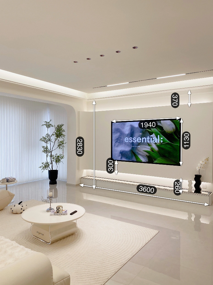 再看極簡風(fēng)無收納背景墻,淺色調(diào) + 大尺寸電視的組合,把 “高級感” 焊在了客廳里。3600mm 的地臺長度剛好容納裝飾擺件,旁邊的綠植一點綴,整個空間清新又利落。沒有收納的設(shè)計讓客廳像被 “拉長” 了一樣,追求 “斷舍離” 生活的寶子,這種風(fēng)格住進(jìn)去就像天天在逛家居雜志。
