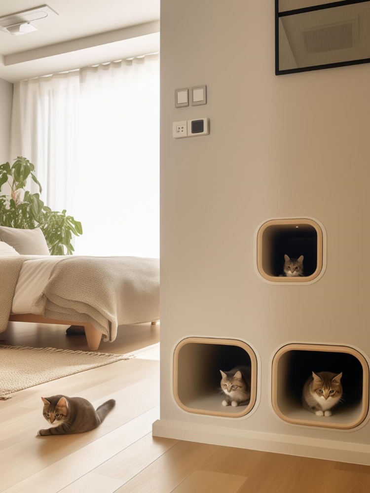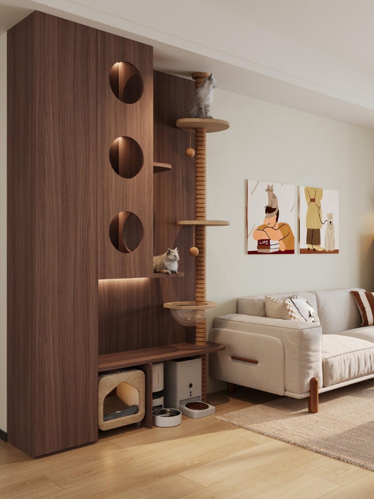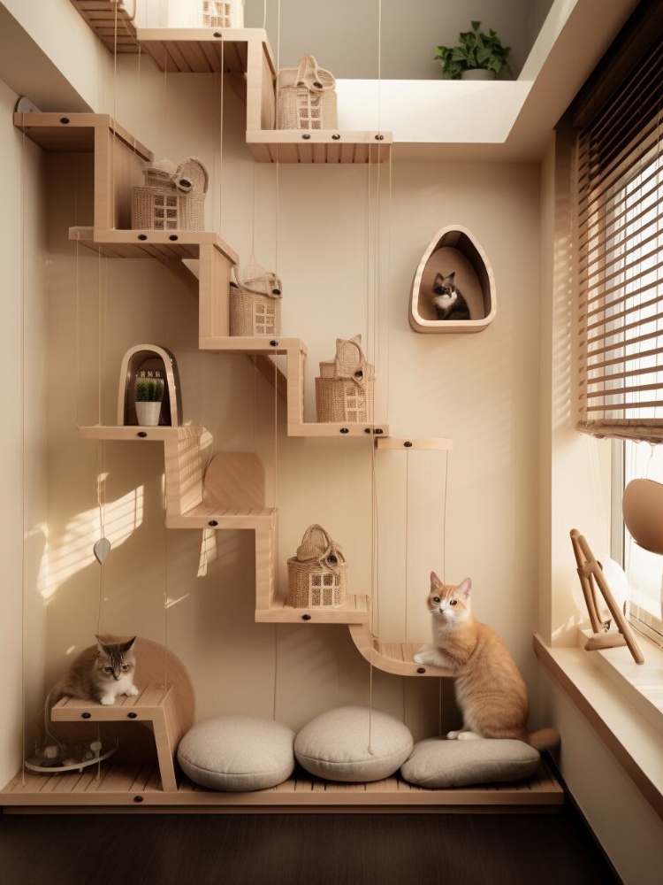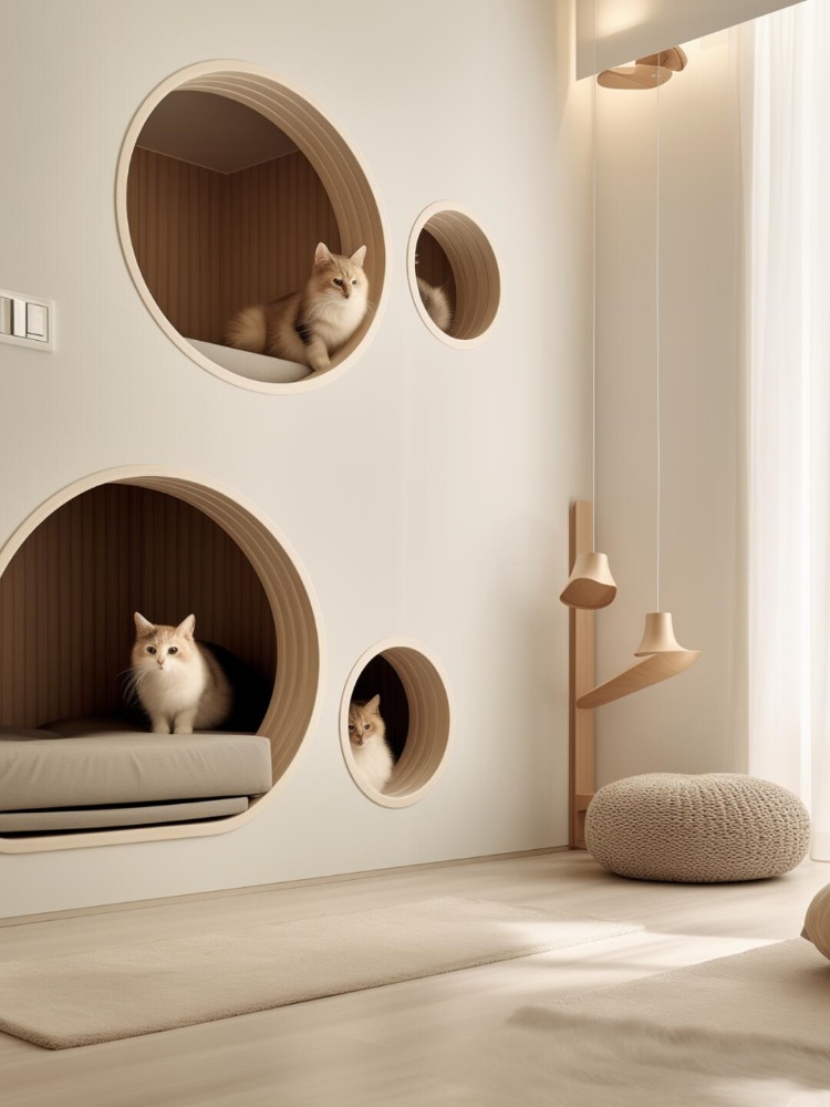 設計思路上,緊扣貓咪 “攀爬、躲藏、觀景” 的天性,以嵌入式貓洞、多層木質(zhì)架構等形式,將貓屋巧妙融入墻體、角落,讓每一處設計既是貓咪的玩樂休憩地,又是家居的美學點綴。
