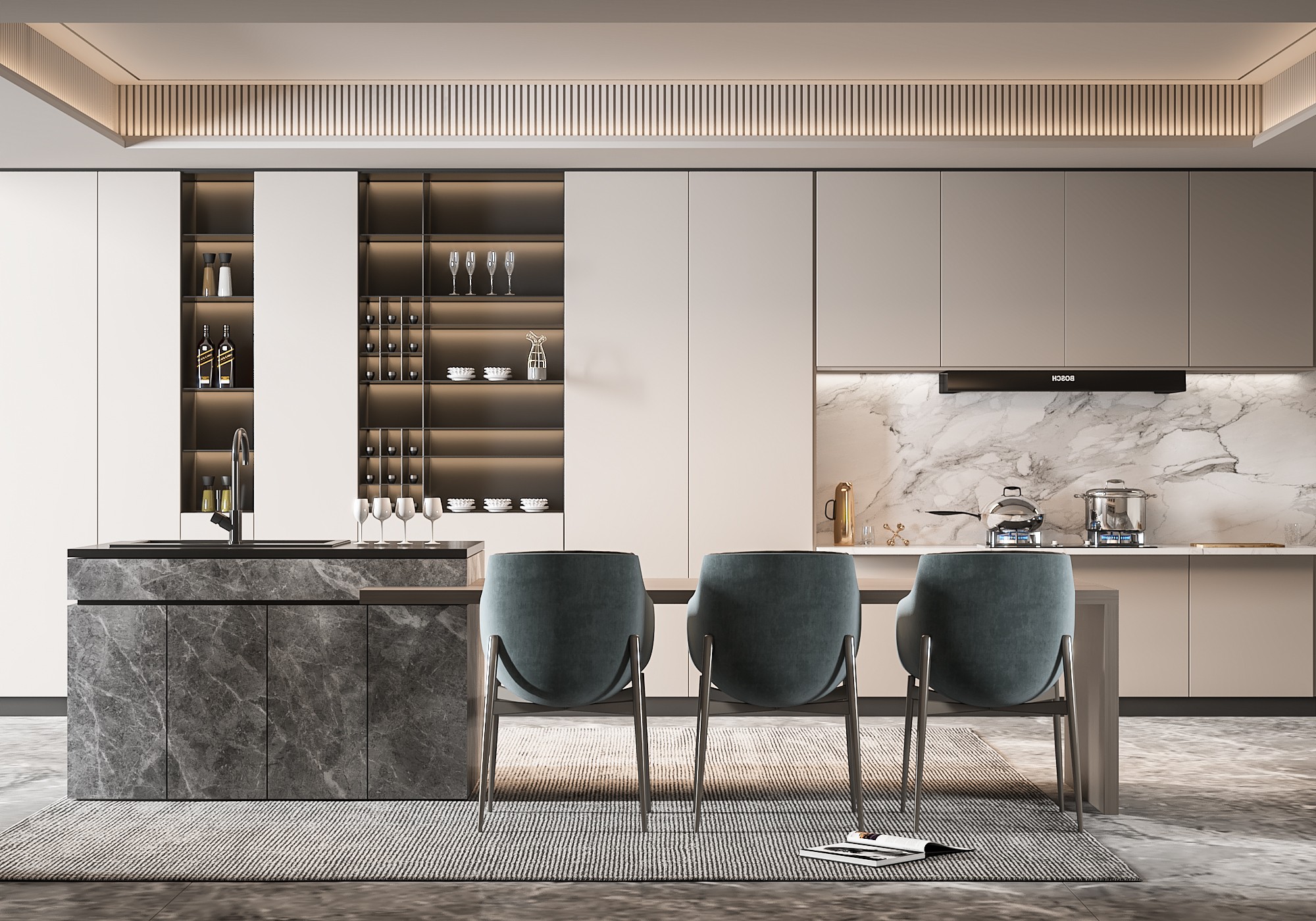 格局上,島臺既是料理中心,又成社交紐帶,或與酒柜、收納區(qū)巧妙融合,讓餐廚空間功能與顏值雙在線。