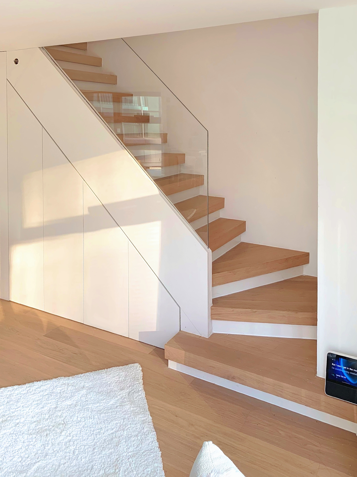 原木踏步 + 玻璃護(hù)欄,通透又顯高級(jí),既填補(bǔ)了樓梯死角,又讓收納量翻倍,小戶型復(fù)式也能裝出大宅整潔感!